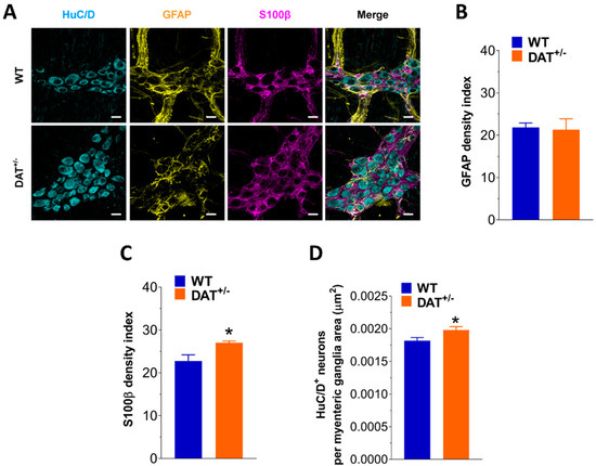 Changes in neurotransmission are known to influence ENS morphology [17,18]. In the myenteric plexus of DAT+/− mice, beside a higher number of HuC/D+ neurons, a marked increase of S100β immunofluorescence was found in ileal preparation from DAT+/− mice, by about 18% compared to WT mice, with no changes in GFAP immunoreactivity (Figure 7).