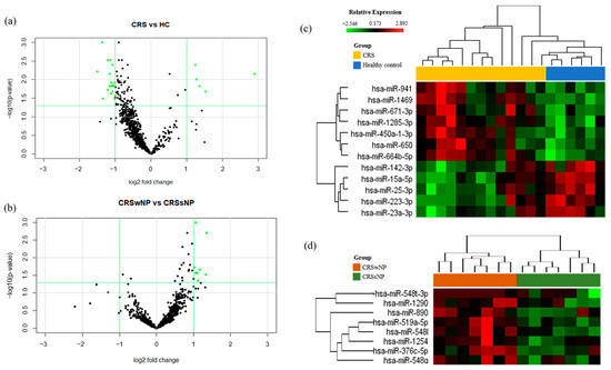 We profiled the expression of 798 miRNAs in NLF-EVs of the CRSwNP, CRSsNP, and HC groups (Table 1 and Supplementary Table S2). Volcano plots were applied between the groups to identify statistically significant differentially expressed miRNAs (Figure 2A). Five upregulated and seven downregulated miRNAs (|FC| > 2 and cutoff p ≤ 0.05) were differentially expressed in the NLF-EVs of CRS patients compared to HCs, while eight upregulated miRNAs (|FC| > 2 and cutoff p ≤ 0.05) were differentially expressed in the NLF-EVs of CRSwNP versus CRSsNP patients. Using heat map analysis, it was possible to observe global differences in the gene expression profile (green (down) and red (up)) between the CRS patients and HCs, as well as the most representative clustering groups of samples and genes for each patient (Figure 2B). Interestingly, in the CRSwNP versus CRSsNP comparison, some patients were grouped in distinctive clusters and demonstrated a similar expression pattern of miRNAs. In contrast, in the CRS versus HC comparison, some patients were not observed in distinctive clusters but still demonstrated a similar expression pattern of miRNAs. Gender, age, and smoking status showed no obvious influence on the miRNA expression level.
