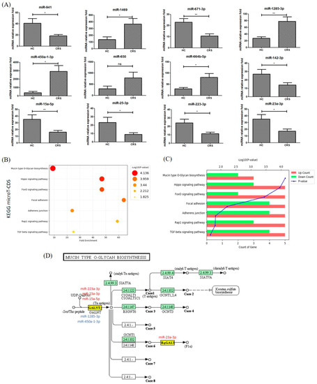 Top 7 KEGG biological pathways revealed by analyzing target miRNAs between NLF-EVs of CRS patients and HCs using DIANA tools. (A) Overexpressed miRNAs in NLF-EVs of CRS patients compared to HCs after adjustment of the outlier values according to the Chauvenet criterion (Student’s t-test; * p < 0.05; ** p < 0.01, ns > 0.05). (B) KEGG enrichment analysis of all DEGs with |FC| > 2 (cutoff). (C) Pathway enriched by up- and downregulated genes and sorted by the value of −log10(p-value). (D) Diagram of the mucin-type O-glycan biosynthesis. Five dysregulated miRNAs (miR-223-3p, miR-23a-3p, miR-15a-5p, miR-1285-3p, and miR-450a-1-3p) were associated with the mucin-type O-glycan biosynthesis by possibly regulating their potential gene targets. KEGG, Kyoto Encyclopedia Gene and Genome; miRNA, microRNA; NLF, nasal lavage fluid; EV, extracellular vesicle; CRS, chronic rhinosinusitis; HC, healthy control; DEG, differentially expressed gene; FC, fold change.