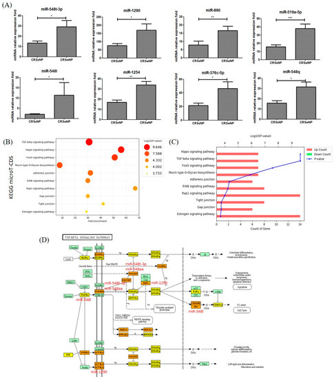 Top 10 KEGG biological pathways revealed by analyzing the target miRNAs between CRSsNP and CRSwNP NLF-EVs using DIANA tools. (A) Overexpressed miRNAs in NLF-EVs of CRS patients compared to HCs after adjustment of outlier values according to the Chauvenet criterion (Student’s t-test; * p < 0.05; ** p < 0.01; *** p < 0.001). (B) KEGG enrichment analysis of all DEGs with |FC| > 2 (cutoff). (C) Pathway enriched by up- and downregulated genes and sorted by the value of −log10(p-value). (D) Diagram of the TGF-β signaling pathway. Six dysregulated miRNAs (miR-1290, miR-548q, miR-548l, miR-1254, miR-890, and miR-548aa/548t) were associated with the TGF-β signaling pathway by possibly regulating their potential gene targets. KEGG, Kyoto Encyclopedia Gene and Genome; miRNA, microRNA; CRSsNP, chronic rhinosinusitis without nasal polyps; CRSwNP, chronic rhinosinusitis with nasal polyps; NLF, nasal lavage fluid; EV, extracellular vesicle; CRS, chronic rhinosinusitis; HC, healthy control; DEG, differentially expressed gene; FC, fold change; TGF-β, transforming growth factor-beta.