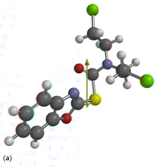 The arrows in Figure 9a–c show the orientation of the electric dipole moment in the ground electronic states of the studied molecules. It is parallel to the CS bond for the molecule VIII and makes angles near 40–45 degrees with this bond in the other two molecules.