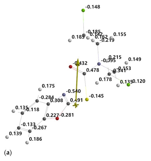 Figure 9a–c shows the electrostatic charges near the constituent atoms of the studied molecules, calculated using Spartan’14 program and expressed as a percentage of the elementary electric charge.