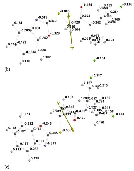 Electrostatic charges near the atoms composing the structures of molecules VIII (a), IX (b), and X (c), respectively.