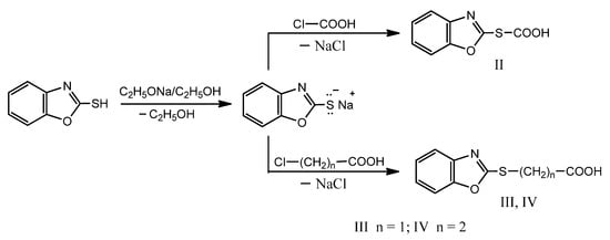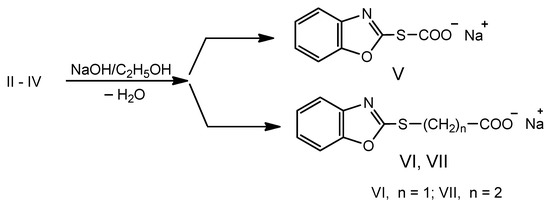 Initially, the sodium salts of the benzoxazole-2-yl-mercapto-formic, acetic, and β-propionic (V–VII) acids were synthesized by refluxing a mixture of acid (II–IV) in alcoholic solution with sodium hydroxide (Scheme 2).