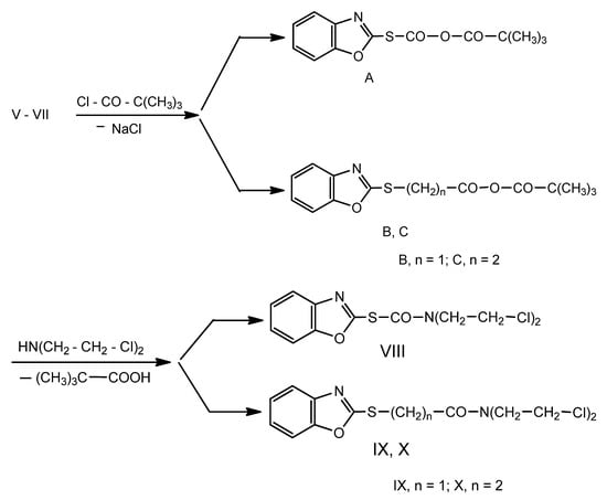 3.2.10. Di-(β-Chloroethyl)-Amides of the Benzoxazole-2-Yl-Mercapto-Formic, Acetic, β-Propionic Acids (VIII–X)