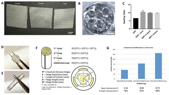 First, 0.08 mm thick OPF+ sheets were embedded with longitudinal ridges spaced 0.2, 0.4, or 1 mm apart (Figure 1A). Our previously used scaffold was fabricated with seven channels that were 2 mm wide and 32 mm long (Figure 1B). Swelling ratios were calculated to be 10.5 ± 0.8 for OPF+ sheets with 1 mm spaced ridges, 9.8 ± 0.4 for sheets with 0.4 mm spaced ridges, and 9.7 ± 0.1 for sheets with 0.2 mm spaced ridges (Figure 1C). Hydrated sheets spontaneously rolled into a spiral configuration (Figure 1D,E). In comparison to a multichannel scaffold (Figure 1B), the rolled-sheet design allowed for a greater volume of open space inside of the scaffold and increased surface area that was dependent on the number of loops in the spiral (Figure 1F,G). Internal volumes and surface areas were calculated by taking into account the number of channels that form between ridges, ridge separation (mm), length of the cylinder (mm), and ridge width (mm) (Figure 1F). A scaffold sheet with 3× loops increased the volume by 2.6 fold (3.34 mm3 to 8.83 mm3), whereas a sheet with 4× loops has an increase of approximately 3 fold (3.34 mm3 to 9.72 mm3) compared to the seven multichannel OPF+ scaffold design (Figure 1F). There was a similar corresponding increase in surface area where sheets with 3× loops had 1.71 fold increase (45.4 mm2 to 77.7 mm2) and 4× loops had 2.87 fold increase (45.4 mm2 to 130.5 mm2) compared to the seven channel design.