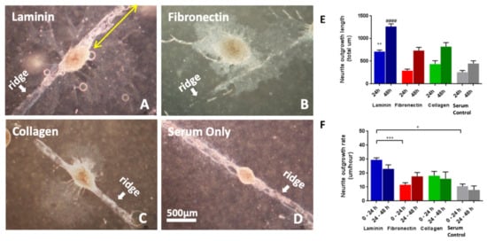 When hydrated, the OPF+ sheets spontaneously form a 3D spiral tube. Hydrogels have been designed to self-roll in previous studies either by introducing reductants to cleave disulfide bonds [], changes in pH and sacrificial layers [], or using light responsive inks [], photolithography [], and magnetic nanorods []. These ridged scaffolds had swelling ratios comparable to our previous studies []. Hydrogels may suffer from low cell attachment due to the hydrated surface layer []. This issue could be addressed by coating the hydrogel sheets with collagen, laminin, or fibronectin, all of which are classically established as ECM coatings used to promote neurite outgrowth [,,,]. The current study shows that DRG explants cultured on laminin-coated OPF+ sheets had longer neurite outgrowth than fibronectin or collagen-coated sheets. In addition, the outgrowth rate of neurites on laminin-coated sheets was faster in the first 24 h of culture. This can be due to the different amount of proteins used or absorbed into the scaffold. Previous studies have demonstrated concentration-dependent differences in cell attachment and outgrowth; however, concentrations used in this study were within range of those used in other studies [,,,]. It is also interesting to note that the DRG outgrowth rate on the fibronectin-coated sheets was still increasing at the 24–48 h time point and may have results in greater outgrowth length at a later time point. When neuronal attachment was measured on or in between the ridges, laminin and fibronectin did equally well. The observed enhancement of neuronal outgrowth and guidance associated with laminin is in keeping with several other studies investigating different substrates for neuronal regeneration [,,]. ECM proteins or their fragments play an important role in cell adhesion through ligand receptor interactions, and these interactions may be an important component to consider in developing novel biomaterials [,,]. In addition, the three-dimensional structure of ECMs help anchor cells and provide axonal guidance []. We show that to maximize the ability of hydrogel scaffolds to anchor neurons and their axons and aid in their outgrowth, ECMs such as laminin and fibronectin are necessary to maximize the regenerative capability of the scaffold.