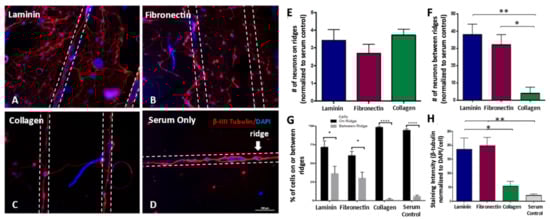 Attachment, alignment, and outgrowth of dissociated DRG neurons on coated OPF+ sheets with ridges 1 mm apart. Immunofluorescent images of b-III tubulin stained axons show attachment and outgrowth from neurons near or on the ridges on OPF+ sheets coated with (A) laminin, (B) fibronectin, (C) collagen, or (D) serum only. The neurites preferentially aligned on the ridges (located between the dotted white lines). The neurons are stained with β-III-Tubulin (red) with a DAPI (blue) counter stain. (E) The number of neurons on ridges (normalized to the number of cells on the ridges with no substrate) of OPF+ sheets coated with laminin, fibronectin, and collagen. (F) The number of cells in between the ridges (when normalized to OPF+ sheets with serum only). (G) Percent of cells on ridges or in between ridges for each condition. (H) Neurite density as measured by staining intensity (mean gray value) of β-III-Tubulin normalized to the mean gray value of DAPI/cell. * p < 0.05, ** p < 0.01, **** p < 0.0001. Data represent means ± SEM.
