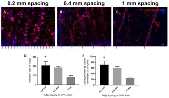 To determine what effect ridge spacing distance may have on neuronal cell attachment and alignment, laminin-coated OPF+ sheets with ridges 0.2, 0.4, and 1 mm apart were used. Tighter ridge spacing increased the number of ridges per area and the overall surface area of the sheet (Figure 4A–C), which in turn improved neuronal cell attachment. Many of the cells settled around or on top of the ridges, extending neurites along the ridge. The number of neuronal cells located on the ridge surface was 2.5 fold greater for the 0.2 mm spaced OPF+ sheets (Figure 4D; 208.6 ± 44.3 cells; p = 0.039) than the 1 mm OPF+ sheets (84.8 ± 15.1 cells). The 0.4 mm OPF+ sheets (Figure 4D; 186.4 ± 11.9 cells; p = 0.1215) had a 2-fold greater number of cells than the 1 mm spaced OPF+ sheets. The neurite density was increased on the OPF+ sheets with ridges more closely spaced (0.2 mm and 0.4 mm apart). We found a 2.9 fold increase in the amount of β-III tubulin staining (normalized to the amount of DAPI staining/cell) when comparing OPF+ sheets with 0.2 mm spaced ridges (Figure 4E; 719.5 ± 130.3 mean gray value; p = 0.012) to OPF+ sheets with 1 mm spaced ridges (251.2 ± 33.4 mean gray value).