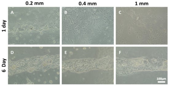 Bright field images (each at 10× magnification) of primary rat Schwann cells grown on OPF+ sheets with ridges 0.2, 0.4, and 1 mm apart. One day after culture the Schwann cells cover the sheet in an unorganized manner (A–C). However, 6 days after culture, the Schwann cells are aligned along the ridges (D–F).