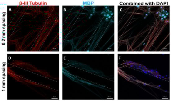 Confocal images showing Schwann cells co-cultured with disassociated DRG neuron on OPF+ sheets with ridges spaced 0.2 mm or 1 mm apart. The cells were labeled with β-III tubulin staining (red, A,C,D,F), Myelin Basic Protein (teal, B,C,E,F), and DAPI (blue, C,F). After culture in media that supports myelination by Schwann cells, the Schwann cells myelinate the disassociated DRG neurites. Since alignment is enhanced by having the ridges on the OPF+ sheet closer together, it can be observed that there are more aligned myelinated neurites on the 0.2 mm spaced OPF+ sheets (A–C) than 1 mm spaced sheets (D,E).