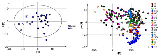 A supervised OPLS model was also calculated in order to achieve the maximum separation between both experimental groups. Figure 2 (left panel) shows the score scatter plot of this model, in which a clear clustering of CSF samples according to the presence or absence of PD was observed. Similar to what was found for the loadings scatter plot displayed in Figure A4 (Appendix A), metabolites responsible for the differences observed were mainly glycerolipids (MAG, DAG, TAG), fatty acids (SFA, MUFA), FAA, glycerophospholipids (PC, PE) and sphingolipids (Cer, SM), which were increased in the PD group (Figure 2, right panel). However, this model had a low predictive ability (Q2X = 0.150), indicating it would be necessary to extend this pilot study to include additional sample cohorts.