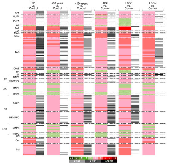 Heatmap representing differential individual metabolic features obtained from the global PD and control comparison and based on disease duration and neuropathological staging. Log transformed ion abundance ratios are depicted, as represented by the scale. Darker green and red colors indicate the change intensity of the metabolite levels, respectively. Grey lines correspond to significant fold-changes of individual metabolites; darker grey colors have been used to highlight higher significances (p < 0.05, p < 0.01 or p < 0.001). It is relevant to highlight that metabolites have been ordered in the heatmap according to their carbon number and unsaturation degree of their acyl chains. Heatmap color codes for log2 (fold change) and unpaired Student’s t-test p-values are indicated at the bottom of the heatmap. Metabolite order is supplied in the “Heatmap datasheet” in Tables S1–S3.