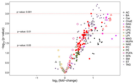 Volcano plot [−log10(p-value) vs. log2(fold-change)] for the PD vs. control subjects comparison. This volcano plot highlights the significance p-value < 0.01 for glycerolipids and, more specifically, triacylglycerols (TAG).