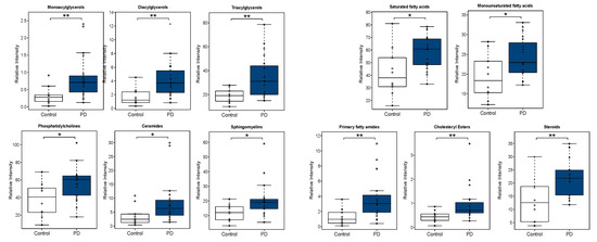 Lipid classes were also calculated as the sum of the normalized areas of all the lipid metabolites with the same chemical characteristics (Table S1). Interestingly, all lipid classes significantly altered in PD subjects were increased. Changes in some of the most relevant metabolite classes are depicted in the boxplots shown in Figure 5.