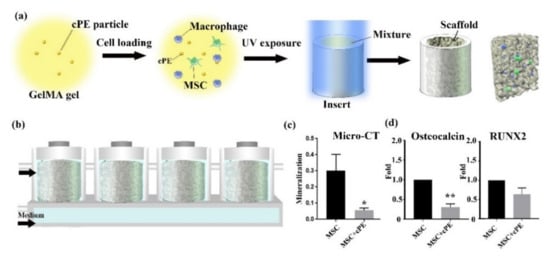 A 3D cell culture simulates a more authentic in vivo physiologic environment than 2D cell culture conditions. In this study, we cultured cell-laden photo-crosslinked methacrylated gelatin (GelMA) [11,12] in a 3D microphysiological system. These 3D constructs were then cultured in a custom-designed, dual-flow microphysiological system. Figure 1a shows the loading process of the scaffold-based 3D cultures [13]. The medium was perfused into the scaffold chamber from both the upper and lower inlets, as shown in Figure 1b. The wear of conventional metal-on-polyethylene implants generates primarily micrometer-sized polyethylene particles (PE) [14,15]. To model the biological events, such as periprosthetic osteolysis, associated with these particles, constructs with or without PE particles (4.62 ± 3.76 µm [15]) coated with lipopolysaccharides (LPS) (contaminated PE particles, cPE) were cultured for 4 weeks. The mineralization of the tissue was determined by micro-CT scanning. As predicted, we found that the addition of 0.125% cPE significantly decreased bone formation by MSCs, as represented by the mineralization of the tissue shown in Figure 1c. Osteocalcin (OCN) and the transcription factor Runt-related transcription factor 2 (RUNX2) are associated with the osteogenic differentiation of MSCs [16]. The changes in mRNA expression of osteogenic markers in response to cPE are evident by qPCR analysis, as shown in Figure 1d. The qPCR analysis demonstrated significantly decreased expression of OCN and reduced expression of RUNX2 in MSC cultures after the addition of cPE.