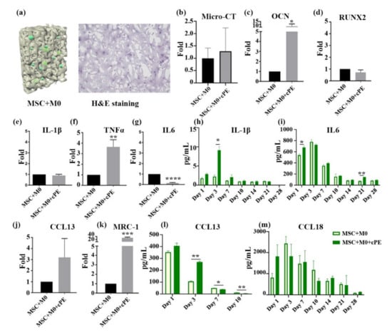 Effects of M0 macrophages on MSC osteogenesis in cPE environment. M0 macrophages polarized to M1 and M2 macrophages and enhanced the osteogenesis of MSCs in the cPE treatment group. (a) Cross-sectional illustration of the 3D co-culture. MSCs were co-cultured with M0 macrophages with or without cPE. H&E staining shows cells evenly distributed throughout the scaffold. (b) Micro-CT analysis of scaffolds. The amount of mineralization did not differ significantly in the cPE group. (c,d) qPCR data of osteogenic gene expression. (e–g) qPCR result of inflammation related genes. (h,i) Levels of secreted pro-inflammatory cytokines. IL-1β and IL6 were detected. (j,k) mRNA expressions of CCL13 and MRC were determined by qPCR. (l,m) Cytokine profile of CCL13 and CCL18 in the medium. (* p < 0.05, ** p < 0.01, *** p < 0.001).