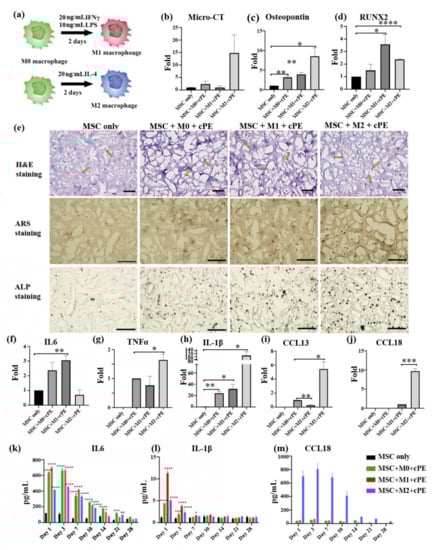 Prior research reported that the phenotypes and functions of macrophages are determined in part by local microenvironmental signals and cues. Interferon-gamma (IFN-γ) and LPS are widely used to differentiate macrophages into the M1 pro-inflammatory phenotype. Conversely, IL-4 converts macrophages into the M2 anti-inflammatory phenotype [23,24]. In our experiments, functional macrophages were co-cultured with MSCs and cPE to mimic the clinical scenario. To further evaluate the relationship between macrophage polarization and MSC differentiation and osteogenesis, macrophages were polarized for 2 days before the co-culture experiments, as shown in Figure 3a. M1 or M2 macrophages were mixed with MSCs and loaded in the 3D hydrogel scaffold, respectively. MSC monocultures in the 3D scaffold served as a negative control. The cultures were collected after 4 weeks. As shown in Figure 3b, micro-CT analysis indicated that all macrophage phenotypes enhanced MSC osteogenic differentiation when exposed to cPE; M2 macrophages produced the most significant effects. Osteopontin (OPN), a major glycoprotein produced during bone formation, is secreted by MSCs and macrophages in our co-culture system. mRNA was harvested from the constructs, and it was observed that macrophages promoted the osteogenic differentiation of MSCs when exposed to cPE, as evidenced by the increased expression of OPN and RUNX2 (Figure 3c,d). The cultured constructs were embedded in an optimum cutting temperature (OCT) compound and cryosectioned for assessment of the phenotypic changes resulting from the elevated expression of osteogenic genes. Hematoxylin and eosin-Y (H&E) staining showed that macrophages interacted with MSCs without direct cell-to-cell contact; thus, differentiation appeared to be mainly mediated by soluble factors. Alizarin Red S (ARS) staining was next used to detect the deposition of calcified matrix as an indicator of osteogenic differentiation. In addition, alkaline phosphatase (ALP) was also assessed as another marker of osteogenic differentiation. As shown in Figure 3e, both ALP activity and the deposition of calcified matrix were detected in all the co-culture treatments. However, MSCs from different groups showed different capacities for osteogenic differentiation. Among them, M2 macrophage co-cultures displayed high ALP activity and increased matrix mineralization, suggesting enhanced osteogenic activity. Our results showed that the activation of macrophages toward an M2 phenotype provides a protective effect on the particle-associated effects.