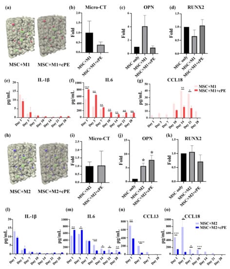 Wear particles can alter the macrophage functional phenotype, including cytokine expression. The upregulation or downregulation of cytokines is associated with different macrophage functions and regulates bone regeneration. To explore the cPE-elicited inflammation, MSCs were co-cultured with M1 and M2 macrophages with or without cPE. Micro-CT and qPCR were conducted to compare the potential for osteogenic differentiation, as shown in Figure 4a–d. The trends suggested that the osteogenesis was not changed by the addition of M1 macrophages. In contrast, the results in Figure 4h–k showed that the M2 macrophage increased OPN expression significantly, regardless of the presence of cPE. ELISA analysis was conducted to compare cytokine secretion. M1 co-cultures expressed higher levels of IL-1β and IL6 than M1 co-cultures in the presence of cPE in the scaffold. Enhanced IL6 production was detected from M1 macrophages with cPE, indicating that cPE promoted inflammatory activation. The results in Figure 4g demonstrate little change in CCL18 secretion activity between day 1 and day 7, followed by a significant increase. However, M1 macrophages co-cultured with cPE showed a reduced expression of CCL18, suggesting that cPE induced a pro-inflammatory response while suppressing the polarization of M1 macrophages to an M2 phenotype. MSCs co-cultured with M2 macrophages showed higher levels of CCL13 and CCL18. However, there was decreased secretion of CCL13 and CCL18 in cPE-containing scaffolds, whereas IL6 was higher in the cPE condition than in M2 co-cultures. Cytokine production decreased over the culture period (Figure 4l–o). Interestingly, few M2 macrophages changed their polarization status during the culture process. These results suggest a protective effect of M2 macrophages on bone regeneration in an inflammatory microenvironment.