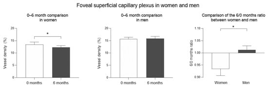 When comparing women and men in the OCTA, women showed a significantly decreased VD in the foveal SCP, suggesting two possible options: either a recovery process could be taking place more slowly in women or they may be getting progressively worse. However, interestingly, when comparing VD values between 0 and 6 months, women showed a significant decrease, while men showed a trend toward improvement. According to this, it appears that women could have an increased risk of worsening VD loss, in comparison with men, 6 months after COVID-19 infection. In this sense, other authors have found that women are also more likely to have persistent neurological and psychological symptoms [20,21], fatigue, post-activity polypnea, and alopecia [19].