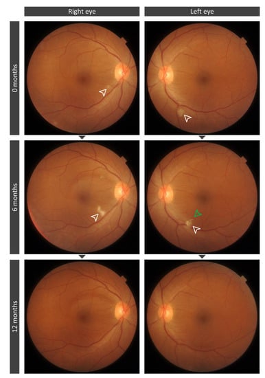 As in our previous paper, when present, CWSs were located outside the analyzed areas, and therefore, the possibility of projection artifacts in the OCT was discarded. As mentioned in our previous paper [9], at 0 months, five patients (eyes = 6) presented CWSs on the posterior pole (20%), including two women and three men with a mean age of 53.83 ± 1.60 years old. Two patients had obesity and hypertension, three had hypercholesterolemia, and one had diabetes mellitus, but none of them had background features of any retinopathy (diabetic, hypertensive, or anemic retinopathy). Interestingly, no CWSs were observed at 6 months evaluation in four out of these five patients (eyes = 4). However, in the remaining patient (eyes = 2), a 45-year-old woman of Latin American origin with obesity and hypertension, the CWSs found in the first evaluation were no longer present, but new CWSs developed bilaterally in different locations of the posterior pole and also an additional microhemorrhage was present in one of the study eyes. At 12 months of evaluation, these CWSs disappeared (Figure 3 and Figure 4). This patient tested negative for HIV.