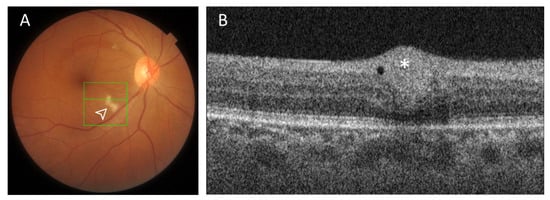 Right eye of a 45-year-old woman showing cotton wool spots (white arrowhead) 6 months after COVID-19 hospital discharge. (A). Right retinal color fundus photography of an isolated cotton wool spots (CWSs). (B). B-scan optical coherence tomography reveals localized swelling of the nerve fiber layer at the location of the CWSs (white asterisk).