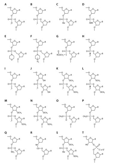 Chemical structures: (A) phosphodiester oligonucleotide (PO-ODN), (B) phosphorothioate ODN (PS-ODN), (C) methylphosphonate ODN (PME-ODN), (D) phosphorodiamidate, (E) phosphomorpholidate,(F) phosphopiperazidate (PN-ODN), (G) acyloxyester PS-ODN, (H) Rp-PS-ODN, (I) Sp-PS-ODN, (J) PS-oligoribonucleotide (PS-ORN), (K) 2′-O-methyl PS-ORN (2′PS-ORN), (L) Rp 2′ PS-ORN, (M) Sp 2′ PS-ORN, (N), 2′ PO-ORN, (O) methylphosphotriester, (P) methylphosphothiotriester, (Q) primary phosphoramidate, (R) carbamate, (S) 2′-O-methylphosphonate, and (T) 2′-5′-ribonucleoside; B = heterocyclic base.