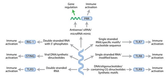Since that initial discovery, it has become clear that there are a large number of such PRRs and that some of these recognize specific PAMPs present in endogenous or exogenous nucleic acids. Pattern recognition receptors include Toll-like receptors (TLRs), RIG-like receptors (RIG-I), and inflammasomes [65]. Of specific interest for nucleic acid therapeutics are TLR-3 (recognizes double-stranded RNA), TLR-7 (single-stranded RNA), TLR-8 (single stranded RNA containing modified bases), and TLR-9 (DNA containing unmethylated CG dinucleotides; Figure 3). Inflammasomes are activated by double-stranded DNA, and RIG-I recognizes RNA with 5′ phosphates.