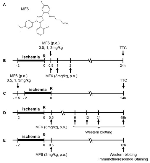 Experimental schedule for MF6 administration (0.5, 1 or 3 mg/kg, p.o.) in I/R mice. (A) Chemical structure of MF6. (B) ICR mice were subjected to tMCAO for 2 h. Subsequently, they were administered orally (p.o.) different concentrations of MF6 (0.5, 1 or 3 mg/kg) 30 min after reperfusion (for dose–response experiments) or 3 mg/kg MF6 at 0.5, 1 and 2 h after reperfusion (for time–response experiments). TTC staining was performed at 24 h after reperfusion. (C) MF6 (0.5, 1 or 3 mg/kg) was administered p.o. to mice 30 min before reperfusion to study the effects of pre-treatment. (D) MF6 (3 mg/kg) was administered to mice 30 min after reperfusion, and FABP levels were measured after 6, 12, 24 and 48 h. (E) I/R mice were administered MF6 (3 mg/kg) 30 min after reperfusion, and after 12 h, the brains were collected for Western blot and immunostaining analyses.