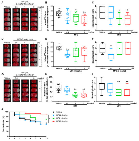 Effects of MF6 post-treatment on I/R injury in mice. Mice were subjected to tMCAO for 2 h. (A–C) MF6 was administrated at different concentrations (0.5, 1 or 3 mg/kg) 30 min after reperfusion. Representative images of TTC staining (A), quantitative analysis of the infarct volumes (B) and neurological deficits (C) at 24 h after reperfusion (n = 11–13). (D–F) MF6 (3 mg/kg) was administrated at 0.5, 1 or 2 h after reperfusion. Representative images of TTC staining (D), quantitative analysis of infarct volumes (E) and neurological deficits (F) at 24 h after reperfusion (n = 7–8). (G–J) MF6 was administrated with different concentrations (0.5, 1, 3 mg/kg) 30 min after reperfusion. Representative images of TTC staining (G), quantitative analysis of infarct volume (H) and neurological deficits (I) at day 7 after reperfusion. The number of living animals in each group every day was recorded, and survival rate (J) was calculated (n = 9–14). * p < 0.05, ** p < 0.01 vs. the I/R-treated group with the CMC group (vehicle). Differences were statistically analyzed using one-way analysis of variance (ANOVA) followed by Dunnett’s test.