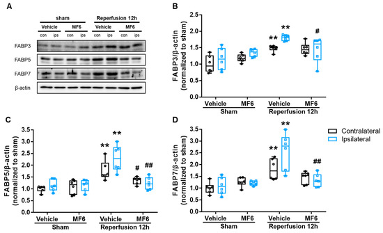FABP3, FABP5 and FABP7 expression levels significantly increased at 12 h post-reperfusion, without particularly serious destruction to the structures of brain tissues. Therefore, we next determined whether MF6 could prevent activation of the FABP3, FABP5 and FABP7 proteins at 12 h after reperfusion. MF6 slightly attenuated the increase in FABP3 protein expression (p = 0.034 vs. vehicle-treated I/R group) in the ischemic area (ipsilateral), but not in the contralateral area (p = 0.851 vs. vehicle-treated I/R group), as shown in Figure 6B. FABP5 and FABP7 expression in ischemic area were significantly suppressed by MF6 treatment (both: p < 0.001 vs. vehicle-treated I/R group), and FABP5 expression in the contralateral area was also significantly suppressed (p = 0.015 vs. vehicle-treated I/R group), but FABP7 was not (p = 0.051 vs. vehicle-treated I/R group) (Figure 6C,D). Moreover, MF6 did not affect FABP3, FABP5 and FABP7 protein levels in non-ischemic mouse brains (sham mice). The present Western blotting data showed that MF6 ameliorated the effects of I/R injury by inhibiting FABP3, FABP5 and FABP7 upregulation.