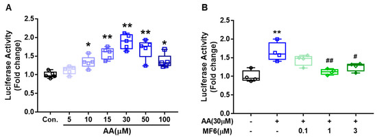 Effects of MF6 administration on AA-induced FABP5 transcriptional activity in SH-SY5Y cells. SH-SY5Y cells were co-transfected with FABP5-pGL3 and Renilla luciferase reporter vectors for 6h. (A) After transfection, cells were stimulated with different doses of AA (5 μM, 10 μM, 15 μM, 30 μM, 50 μM or 100 μM) for 24 h (n = 5 per group). (B) After transfection, cells were treated with AA/BSA and MF6 (0.1 μM, 1 μM or 3 μM) at the same time for 24 h (n = 4 per group). Promoter activity were represented as firefly/Renilla luciferase activity and were normalized to control cells (without AA treatment). * p < 0.05, ** p < 0.01 vs. the BSA-treated cells (Con.); # p < 0.05, ## p < 0.01 vs. the AA and vehicle-treated cells. Differences were statistically analyzed using Student’s t-test or one-way analysis of variance (ANOVA) followed by Dunnett’s test.
