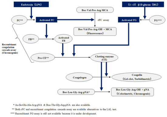 It has been more than five decades since the discovery of the remarkable benefits of horseshoe crab blood in the rapid detection of bacterial components [1]. LAL is an aqueous extract of horseshoe crab (Limulus polyphemus) blood cells, and the LAL test is the most sensitive and reliable method applied for in vitro detection of bacterial endotoxins [2]. Endotoxins, also known as LPS, derived from the cell membrane of Gram-negative bacteria, are closely linked to biological properties such as pyrogenicity, toxicity, and mitogenicity and are involved in the production of proinflammatory cytokines through Toll-like receptor (TLR) 4 signaling. The gel-clot LAL test was approved by the Food and Drug Administration (FDA) in the 1970s and has been widely adopted as the official method for detecting bacterial endotoxins [3]. Iwanaga et al. were the first to report that LAL is activated by bacterial endotoxin based on the endotoxin-triggered factor-C (FC)-mediated coagulation cascade [4]. LAL is also activated by a major polysaccharide from the fungal cell wall, β-glucan, via the β-glucan-activated factor-G (FG)-mediated coagulation pathway (Figure 1) [5]. Based on these findings, we successfully developed the world’s first endotoxin and β-glucan-specific chromogenic LAL reagents (Endospecy and Gluspecy; Seikagaku Corp., Tokyo, Japan) [6,7]. Gluspecy is a former trademark of G-test. For the purpose of evaluating endotoxin contamination in parenteral drugs, medical devices, and raw materials, three types of LAL tests (gel-clot, chromogenic, and turbidimetric techniques) were harmonized in 2012 for compendial methods listed in the three pharmacopeias: The United States Pharmacopeia (USP), Japanese Pharmacopeia (JP), and European Pharmacopeia (Ph. Eur.).