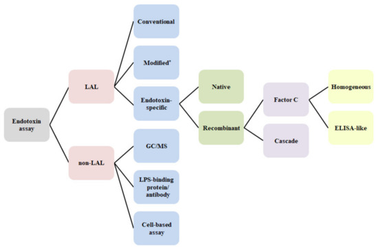 As shown in Figure 2, endotoxin assay can be divided into two categories: LAL and non-LAL assay. The LAL assay is officially used with a different type of formulation that comprises conventional or endotoxin-specific reagents for both end-point and kinetic assay formats [6,39]. Other techniques (modified LAL) include ones such as ESP, the bioluminescence assay using mutant luciferase, and the ELISA-like assay as described earlier. As a different approach, a lab-on-a-chip device (Endosafe-PTS; Charles River Laboratories, Charleston, SC, USA) was first introduced as a modified technique to further improve the usability and simplicity of the LAL assay [40]. Furthermore, LAL alternatives based on recombinant technologies have recently been attracting a great deal of attention from the perspective of the global pharmacopoeia [41,42,43,44]. Recombinant alternatives are specific to endotoxin, and consist of two types of reagents: recombinant Factor C and cascade enzymes (see “next-generation LAL technology”). Recently, Bolden et al. reviewed currently available recombinant alternatives to horseshoe crab blood lysates and their comparability [45].