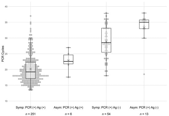 Based on these findings, further analyses were performed to examine the role of PCR cycle time (i.e., potential viral load) in the detection of the virus by the rapid antigen test. It was observed that symptomatic patients displayed lower cycle thresholds in the PCR analysis (see Figure 1) regardless of whether they were also Ag-positive for the virus. Reasons for this observation are not straightforward, but it may be that some SARS-CoV-2 infections are missed due to sampling or that lower PCR cycle thresholds may be a result of an unrecognized inflammatory immune reaction. Regardless, symptomatic patients seemed to require fewer PCR cycle times to detect the virus. Violin dot plots of the findings (Figure 1) demonstrated that subjects that were PCR-positive but Ag-negative displayed cycle times clustering at the higher end of the scale.