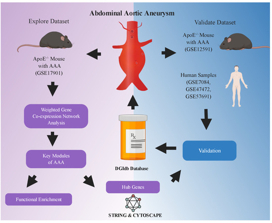 Flowchart of analysis in the study. GSE17901 was a mouse dataset containing AAA samples collected on day 7, day 14 and day 28, which was used for exploring the key modules and hub genes related to AAA progression. Hub genes were identified through the STRING database and Cytoscape software (San Diego, CA, USA). Key genes were further selected from the hub genes and validated in the mouse (GSE12591) and human (GSE7084, GSE47472 and GSE57691) AAA datasets. Finally, potential drugs or compounds targeting these key genes were screened in the DGIdb database. AAA: abdominal aortic aneurysm. The flowchart was created with BioRender.com (accessed on 11 April 2021).