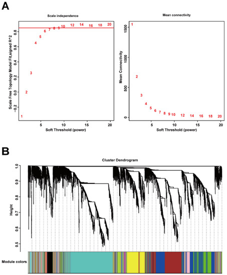 Construction of gene co-expression network by WGCNA. (A) Determination of soft-thresholding power for scale-free network construction. Here, we set the coefficient threshold at 0.85, and the soft-threshold was 9; (B) cluster analysis of the dendrogram and identification of co-expressed modules. In this study, we got 15 related co-expression modules.