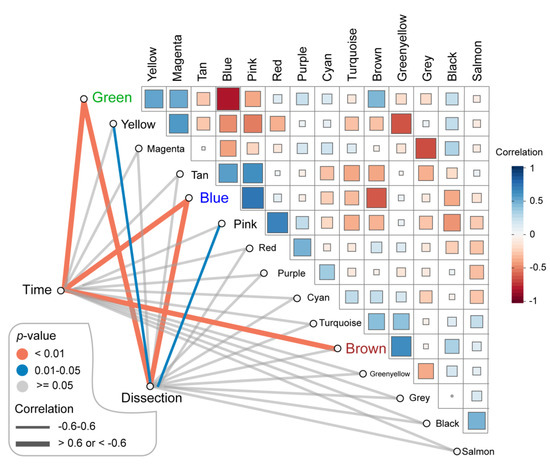 The following are available online at https://www.mdpi.com/article/10.3390/biomedicines9050546/s1, Figure S1: Sample clustering and module relations to sample traits. (A) Sample dendrogram and trait heatmap. The color intensity of time was proportional to the day of the sample collected. The red color in dissected represents the occurrence of dissection in the sample; (B) Module trait relationships. Each row corresponds to a module eigengene (ME) and each column to a sample trait, Figure S2: Correlation of the module membership and the gene significance. (A–C) The relationship between gene significance of time and module membership; (D–E) The relationship between gene significance of dissection and module membership. The color indicates the module, and the dot indicates the gene within the module., Table S1: Potential target agents identified based on drug-gene interaction in DGIdb database.