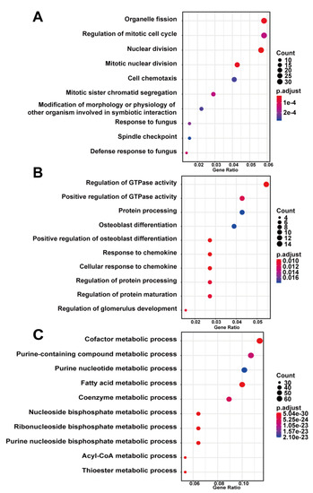 Gene ontology enrichment analysis of key modules of AAA progression. (A) blue module; (B) green module; (C) brown module. Count—the number of genes in the given GO term. Gene ration—the percentage of total genes in the given GO term.