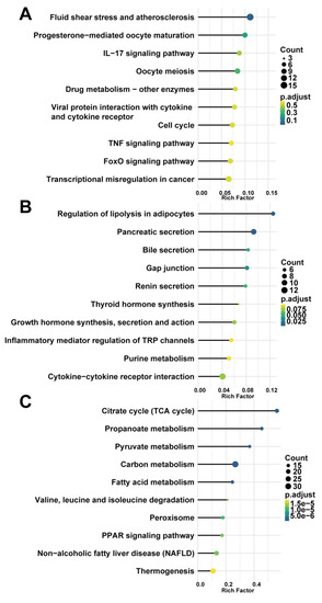 KEGG pathway enrichment analysis of key modules. (A) blue module; (B) green module; (C) brown module. Count—the number of genes in the given KEGG pathway. Rich factor—the ratio of the number of genes annotated in a pathway to the number of all genes annotated in this pathway.