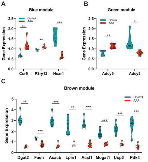 To explore the hub genes that regulate AAA development, we imported the top 10% of genes with the highest connectivity into the String online database for protein–protein interaction detection, and networks were formed in Cytoscape (San Diego, CA, USA) (the PPI networks were stored in the NDEx: accessed on 11 December 2020 from https://bit.ly/37XZZWh; https://bit.ly/3a7Q2sc; https://bit.ly/38fyckz). With the cytoHubba plugin using the MCC method, the top 10 hub genes were identified in the key modules, namely, in the blue module (Ccr5, Fpr2, Ccr2, Fpr1, P2ry12, Hcar1, Ppbp, Aif1, Sirpb1b, Clec4n), green module (Gnai1, Adcy5, Adcy3, Rnase2a, Cxcl13, Clca1, Ear10, Ear1, Npr1, Ccl11), and brown module (Lpl, Dgat2, Fasn, Acacb, Lpin1, Acsl1, Mogat1, Lep, Ucp3, Pdk4) (Table 2).