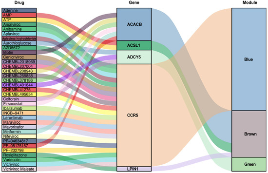 The seven key genes CCR5, ADCY5, ADCY3, ACACB, LPIN1, ACSL1, and UCP3 were used as the potential druggable targets for AAA treatment. The drug–gene interaction results from the DGIdb database revealed 35 potential target drugs/compounds for AAA treatment. Of these, 23 drugs targeted CCR5, among which maraviroc had the highest score of prediction; seven drugs targeted ACACB, two drugs each targeted ACSL1 and ADCY5, and one drug targeted LPIN1 (Figure 7, Table S1). No potential drugs could be identified for ADCY3 and UCP3