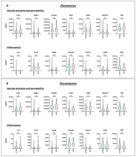 Pre- and postoperative serum biomarker profiling (no-POD and POD). Serum was sampled prior to (A) and following surgery (B) from a mixed cohort of consecutively recruited elective non-cardiac, as well as cardiac surgery patients. Biomarker profiling was performed using the multiplex array technique. The whole cohort was divided according to development of postoperative delirium (POD). Data are given as median values (black dashed line) with 25th and 75th percentile (white dashed lines) and were compared using the Mann-Whitney U test. no POD: n = 85, POD: n = 33. ns = not significant, * p < 0.05. E-Sel = E-Selectin, ICAM-1 = Intercellular Adhesion Molecule 1, VCAM-1 = Vascular Cell Adhesion Protein 1, SDC1 = Syndecan-1, THBD = Thrombomodulin, ANGPT2 = Angiopoietin-2, TIE2 = Tyrosine Kinase with Immunoglobulin-like and EGF-like domains 2, IL-8 = Interleukin-8, CCL2 = CC-chemokine Ligand 2, RAGE = Receptor for Advanced Glycation Endproducts, CXCL5 = C-X-C Motif Chemokine 5, uPAR = Urokinase Plasminogen Activator Surface Receptor, and NSE = Neuron-specific Enolase.