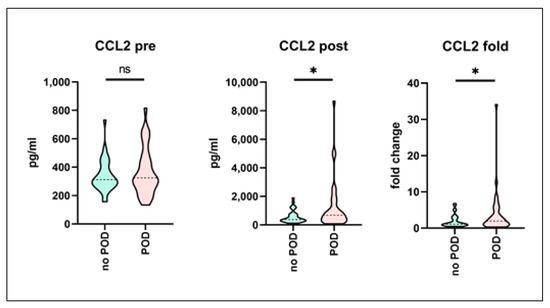 Pre- and postoperative serum biomarker profiling (no-POD and POD) following propensity score matching. Serum was sampled prior to and following surgery from a mixed cohort of consecutively recruited elective non-cardiac as well as cardiac surgery patients. Biomarker profiling was performed using the multiplex array technique. Development of postoperative delirium (POD) was assessed, and POD-positive patients were matched with respect to no-POD controls using propensity score matching. Figure shows results for the CCL2 (CC-chemokine Ligand 2) serum levels. Data are given as median values (black dashed line) with 25th and 75th percentile (white dashed lines) and were compared using Wilcoxon rank-sum test. no POD: n = 33, POD: n = 33. ns = not significant, * p <0.05.