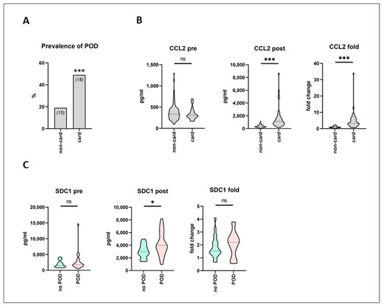 According to Fisher’s exact test, the incidence of POD was significantly increased in cardiac surgery patients, as compared to non-cardiac surgery (18 out of 37 (49%) vs. 15 out of 81 patients (19%), p = 0.002; Figure 4A). In cardiac surgery patients, CCL2 was the only one among all analyzed biomarkers that showed a highly significant difference in postoperative absolute (1117 (670.8–1749) vs. 315.9 (240.1–481.6) pg/mL), as well as fold-change increase (3.21 (2.51–6.17) vs. 0.93 (0.71–1.29)), irrespective of POD development, as compared to the non-cardiac surgery patients (p < 0.0001) (Figure 4B). Postoperative CCL2 serum levels were more than 3.5 times higher following cardiac surgery than following non-cardiac surgery. When the subcohort of cardiac surgery patients was furthermore divided according to subsequent POD development, only postoperative SDC1 serum levels were significantly increased in POD patients, as compared to no-POD cardiac surgery patients (3985 (3005–5871) vs. 2951 (2451–3959) pg/mL, p = 0.04) (Figure 4C).