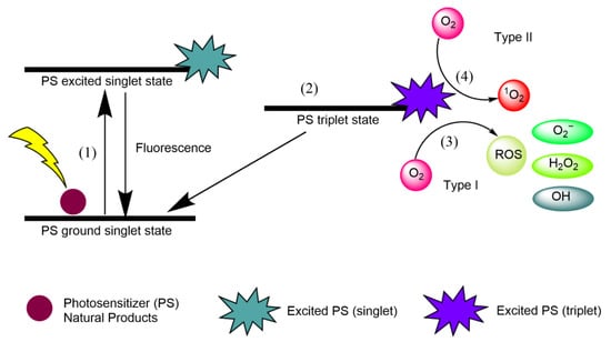 Singlet oxygen (1O2) is an extremely short-lived and reactive form of oxygen that is involved in photochemical reduction processes. In type I reactions, electrons are stripped from biological macromolecules and •OH is transformed into hydroxide ions [1]. Superoxide dismutase (SOD) converts O•− into HO and O, and H2O2 participates in the Fenton reaction, resulting in the homolytic fission of the oxygen–oxygen bond in H2O2 to yield a hydroxide ion [1]. In type II reactions, 1O2 interacts with double bonds, sulfur moieties, and aromatic components of macromolecules in Diels–Alder cycloadditions [1]. Type I and type II reactions involving natural PSs are illustrated in Figure 1, and each step is explained below.