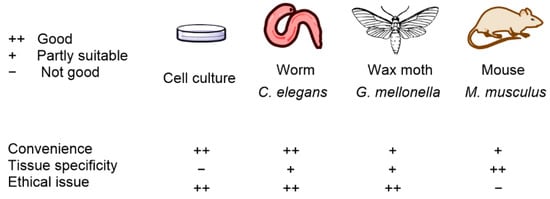 The wax moth G. mellonella is another model organism used to identify the efficiency and toxicity of antimicrobial agents and is likewise a preferred model organism for avoiding ethical concerns related to the use of mammals. Huang et al. [61] reported that G. mellonella is a leading infection model organism, especially in the field of PDT against Candida albicans and S. aureus. G. mellonella studies investigate light penetration, and Figueiredo-Godoi et al. [62] found that light is distributed 0.27–2.45 mm below cuticle G. mellonella larvae. Model organisms and their main properties are summarized in Figure 2.