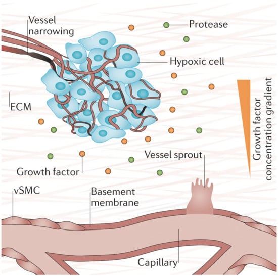 When there is insufficient oxygen supply to the cells (hypoxia), the cells begin to release growth factors that form gradients within the tissue that initiates new vessel sprouting. Reprinted and adapted with permission from Briquez, P.S. et al (2016) [76]. Copyright (2016) Springer Nature.