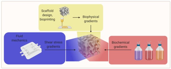 An efficient way to study different material properties simultaneously while evaluating the influence of other experimental parameters could be the use of gradients of biophysical parameters (e.g., porosity, stiffness, topographical features) and biological as well as biochemical parameters (e.g., cell seeding density, scaffold crosslinking density, growth factor concentration, and growth factor isoform ratio) [2,9]. An overview of the gradient parameters is shown in Figure 5.