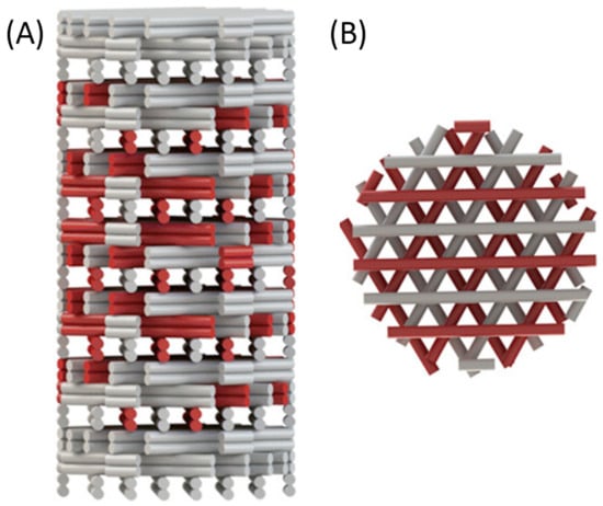 Gradient-like distribution of VEGF-loaded strands (red) within the scaffold: (A) side view of the scaffold showing different densities of VEGF-loaded strands in each layer; (B) top view of the same scaffold. Reprinted with permission from Bittner, S.M. et al. (2018) [21]. Copyright (2018) Elsevier.